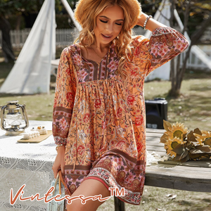 Lassen Sie sich von der unkonventionellen Ausstrahlung unseres Vintessa™️ verzaubern. Mit seinen langen Ärmeln, dem gebundenen V-Ausschnitt und der lockeren Mini-Silhouette bietet es Komfort und Stil für Sommertage und legere Anlässe. Das lebendige Blumenmuster verleiht dem Kleid einen verspielten Touch und macht es zu einem Must-Have für Modebegeisterte.
